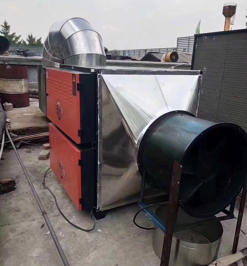 PVC手套在高溫生產烘制過程中,有10-15%的混合料溶劑揮發形成烘烤煙氣〔由降粘劑,DOP、TXIB、DOA、環氧大豆油、鈣鋅穩(安)定劑組成〕,這些煙氣彌漫在車間內部會嚴重影響生產環境的清潔,直接排放到外界空氣中也會造成原材料浪費。